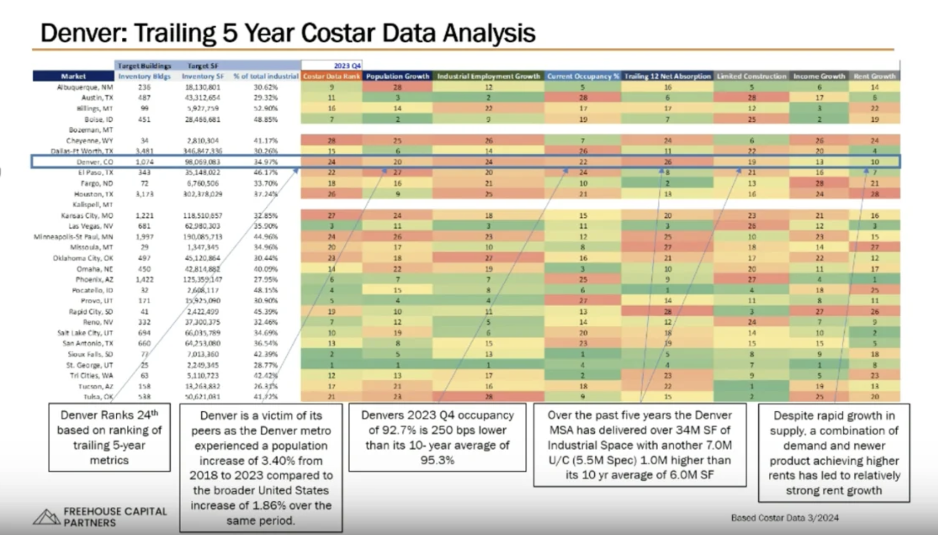 In the last five years, Denver added 34 million square feet of new space, with 7 million under construction. Of this, 5.5 million square feet are speculative, potentially increasing vacancy rates through 2024.